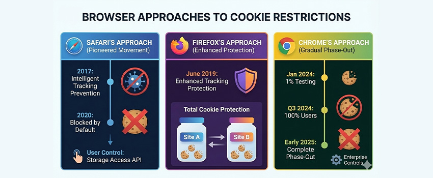 Each major browser handles cookie restrictions differently.